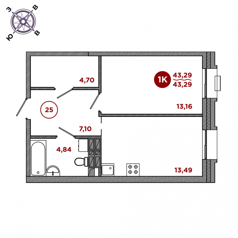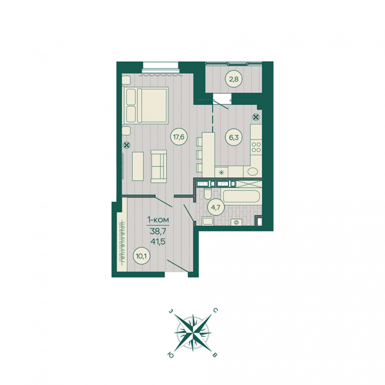 1 комнатная, 41.13 кв.м