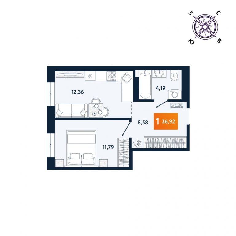 1 комнатная, 36.96 кв.м