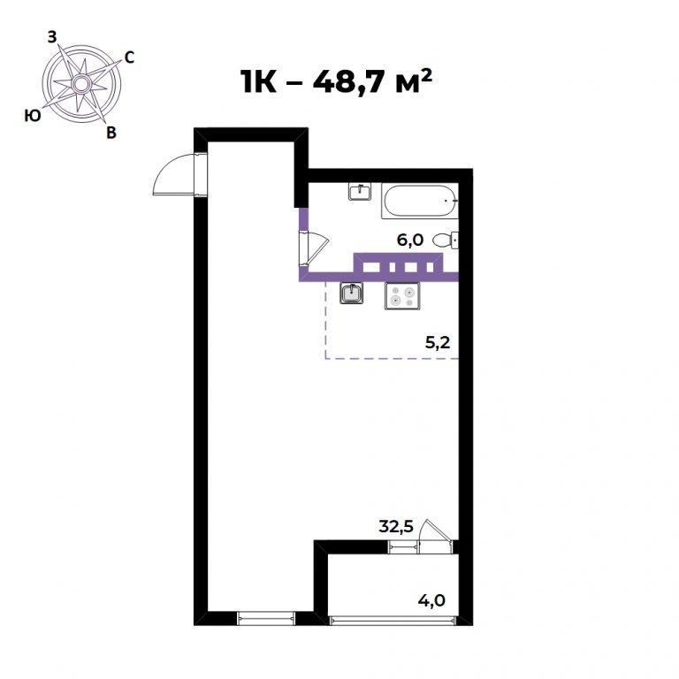 2-x комнатная, 52.3 кв.м