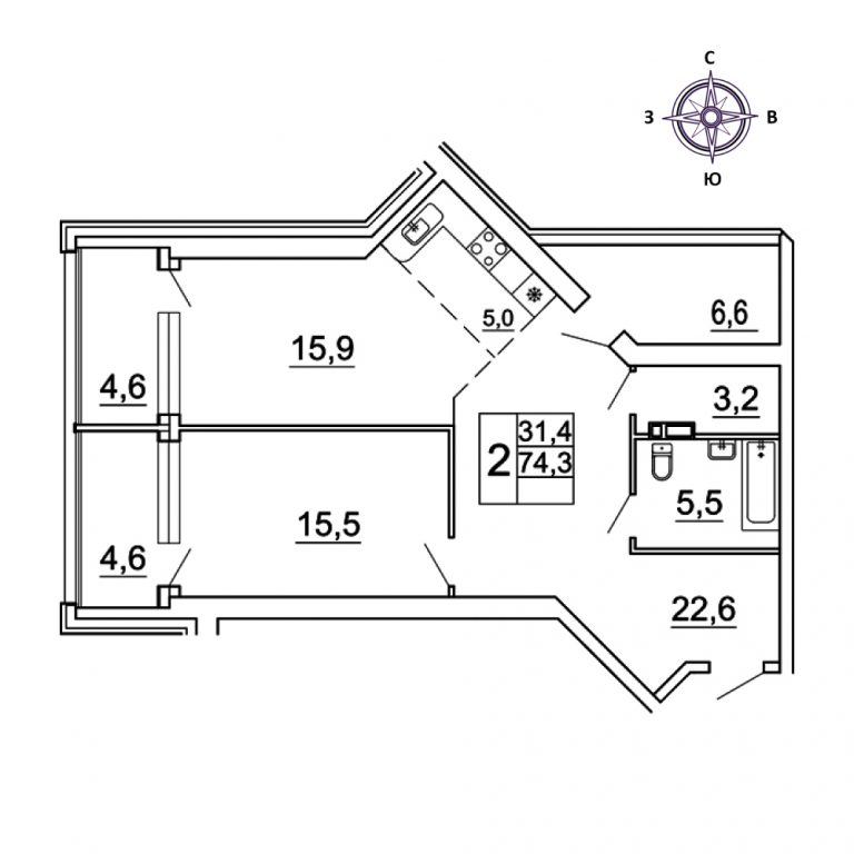 3-x комнатная, 74.42 кв.м